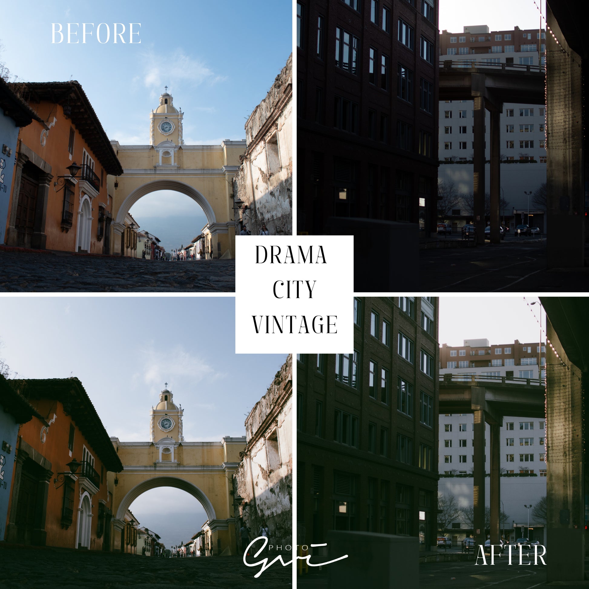 - DRAMA VINTAGE (1 presetas): Suteikia nuotraukoms nostalgišką, nesenstančią išvaizdą su vintažiniais tonais ir subtiliu blukimu, puikiai tinka klasikiniams kelionių momentams užfiksuoti.